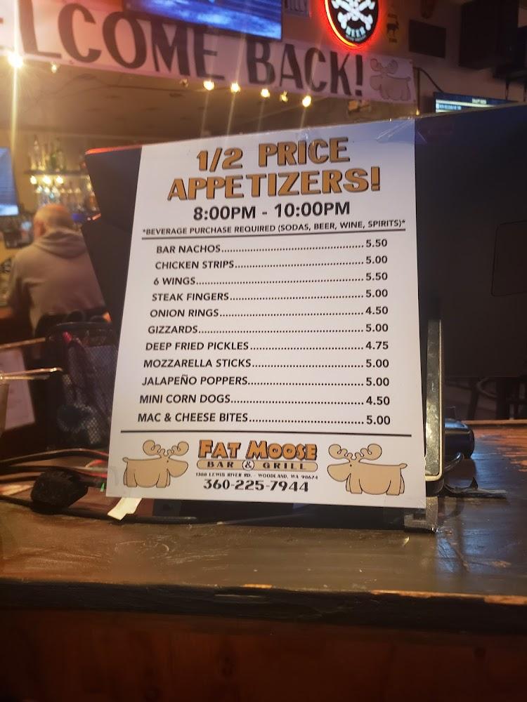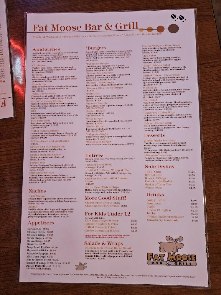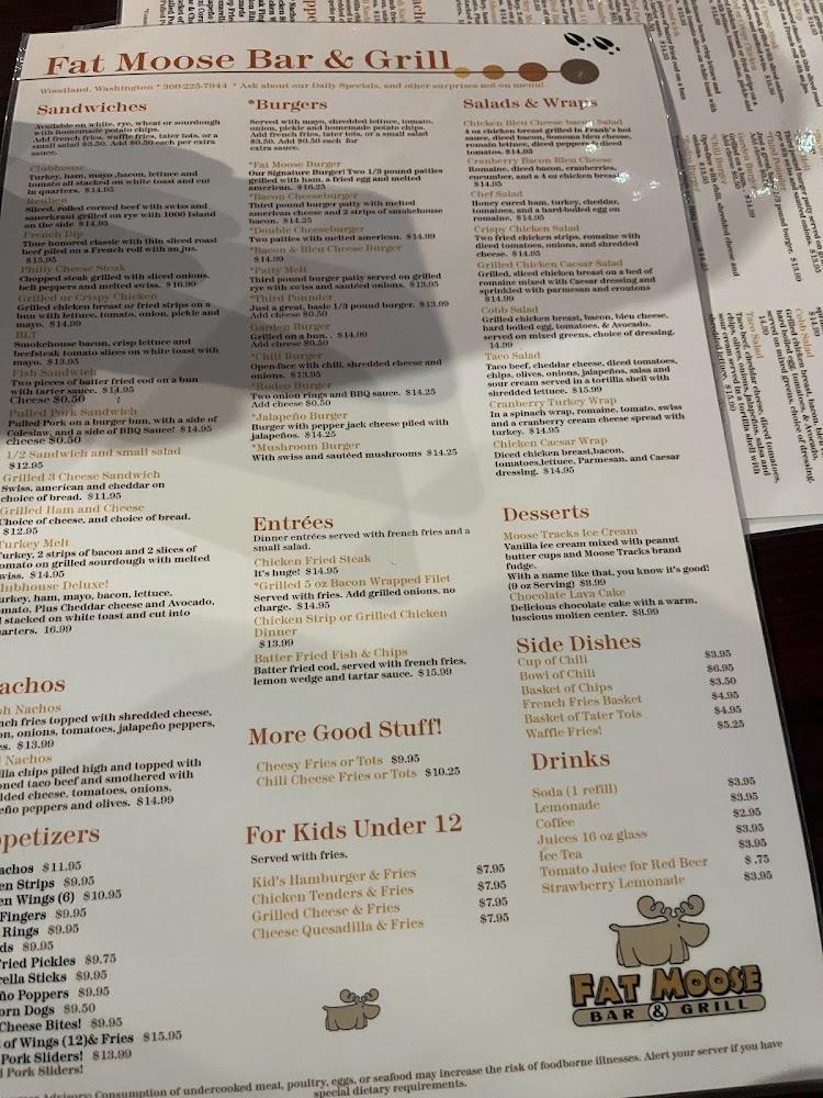 Welcome to Fat Moose Bar & Grill, your favorite spot in Woodland, WA! Located at 1382 Lewis River Rd, we offer a cozy atmosphere perfect for breakfast, lunch, or dinner. Enjoy our succulent grilled specialties paired with a wide selection of local beers and expertly crafted cocktails. With amenities like outdoor seating, delivery options, and karaoke nights, there's something for everyone. Our venue is wheelchair accessible, ensuring all guests feel welcome. Whether you're dining solo or with friends, join us for a hearty meal, happy hour specials, and a lively environment at Fat Moose!