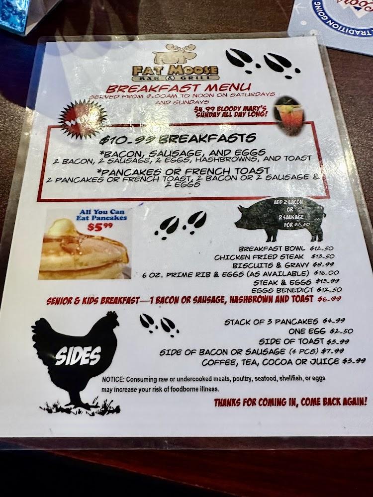 Fat Moose offers a well-rounded menu showcasing classic American fare. Breakfast shines with options like pancakes and breakfast burritos. Lunch includes sandwiches and rich appetizers, ideal for pairing with drinks or sharing with friends.